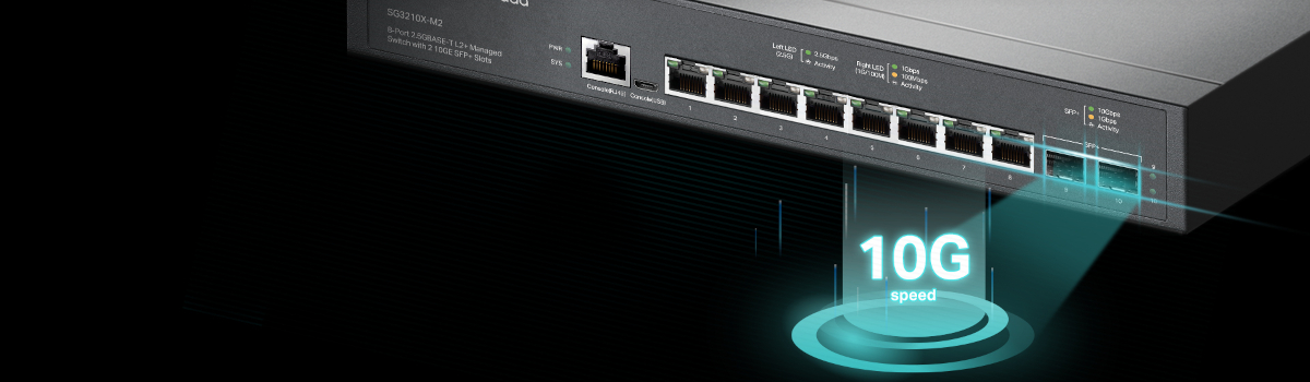 - TP-Link SG3210X-M28 portów o prędkości 2,5Gb/s zapewnia dostęp do najwyższej wydajności sieci wielogigabitowej. Autonegocjacja prędkości połączenia wykrywa możliwości łącza i inteligentnie dostosowuje porty pod względem zgodności i optymalnej wydajności d