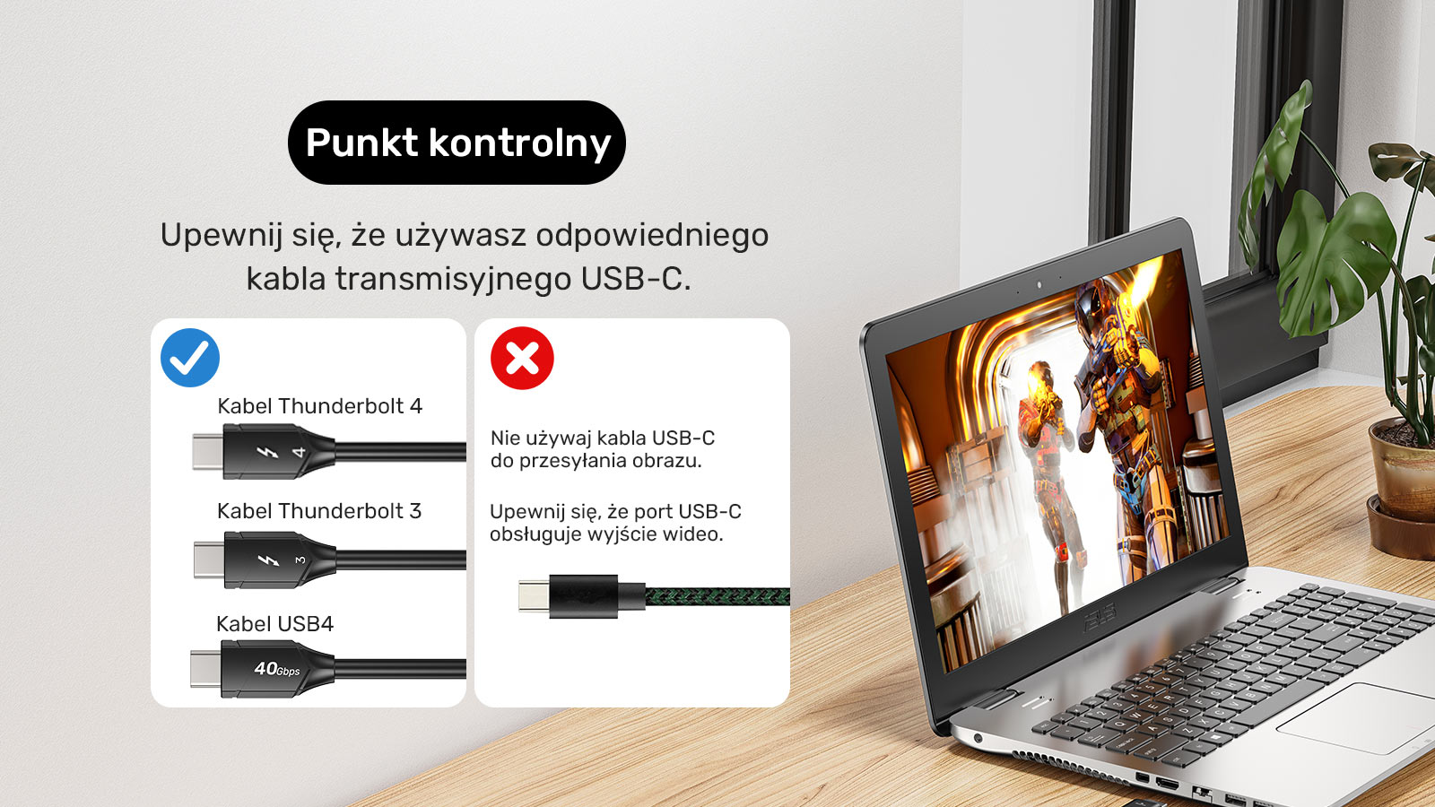- Do uzyskania pełnej funkcjonalności: (w tym 4K@60Hz) wymagany jest w pełni funkcjonalny kabel USB-C (standard USB 3.2 lub wyższy, np. Thunderbolt 3, 4 lub USB4). Zwykłe kable USB-C przeznaczone tylko do ładowania nie zapewnią transmisji wideo.