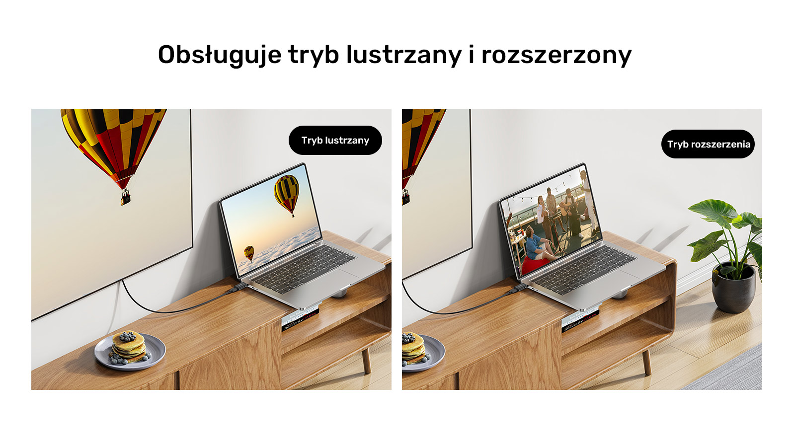 Dzięki trybom klonowania (Mirror) i rozszerzania pulpitu (Extend), adapter świetnie sprawdza się w biurze, przy pracy z dokumentami, w prezentacjach i przy wielozadaniowości. To uniwersalne narzędzie dla każdego, kto korzysta z więcej niż jednego ekranu.