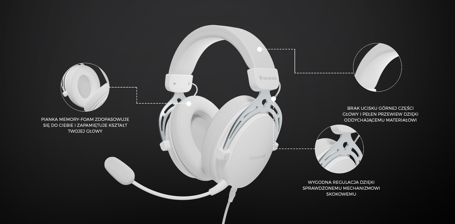 Genesis Toron 531 to zamknięta konstrukcja wokółuszna, która skutecznie odizoluje Cię od dobiegających z zewnątrz odgłosów. Mniej niepożądanego hałasu = większe skupienie na grze, a to jeszcze nie koniec. Oddychający i miękki materiał umieszczony po wewnętrznej stronie pałąka zapewni optymalną temperaturę i zminimalizuje ryzyko pocenia. Nie bez znaczenia są też wygodne, skóropodobne nauszniki memory foam z wierzchnią warstwą wykonaną z tekstylnego materiału – nie tylko dopasowują się do użytkownika i zapamiętują kształt głowy, ale i łączą najlepsze cechy nauszników skóropodobnych (tłumienie dźwięków) i tkaninowych (maksymalny komfort w kontakcie ze skórą). W zestawie znajdziesz też dodatkowy zestaw w pełni tekstylnych padów, który wspomoże Cię w upalne dni. Do tego skokowa regulacja szerokości i zero jakiegokolwiek ucisku. Czy potrzeba czegoś więcej?