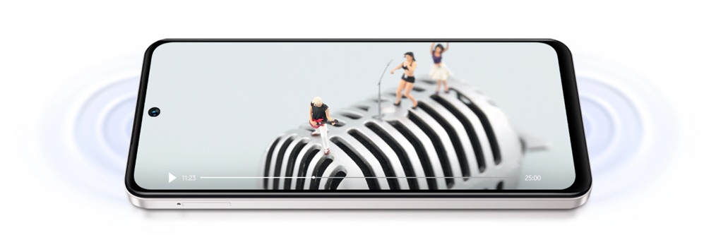 Smartfon został wyposażony w 6,68-calowy wyświetlacz Dotch Display o odświeżaniu 90 Hz, który oferuje wyjątkową ostrość, płynność i jasność aż do 1000 nitów. Tryb ochrony oczu zapewnia komfort nawet podczas długiego korzystania w pełnym słońcu. Dodatkowo podwójne głośniki z technologią podbicia głośności do 300% gwarantują wyraźny dźwięk, nawet w głośnym otoczeniu, dzięki czemu filmy, gry i muzyka zyskują zupełnie nowy wymiar.